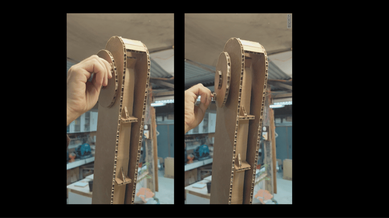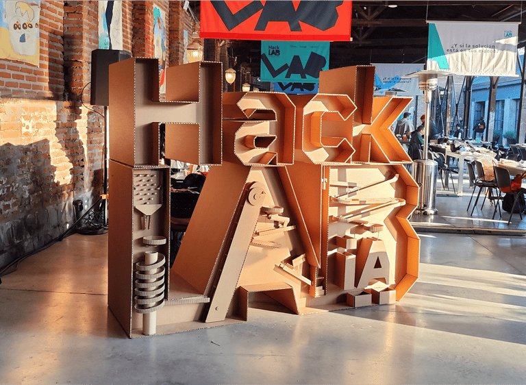 Construimos una identidad basada en la lógica de una máquina tipo Rube Goldberg: un sistema donde cada acción activa la siguiente. Este principio se tradujo en un lenguaje visual dinámico, con elementos que reaccionan, se conectan y generan movimiento. Combinamos formas con comportamiento físico, referencias digitales y texturas elásticas que evocan el “hackeo” como proceso creativo, llevando esta lógica a animación, gráfica y soportes materiales.